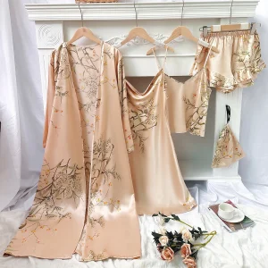 5pcs Floral Print Long Sleeve Robe Cami Dress Cami Top Ruffle Hem Shorts Simple Pajamas Sets for Women
