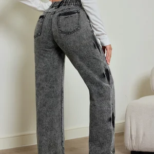 2025 autumn new women’s jeans, tie-dye contrast washing, elastic waist, high waist straight jeans