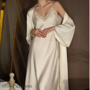 Plus Size Long 2PCS Robe Nightgown Set Pajama Elegant Kimono Bathrobe Gown Sleepwear Summer Sexy Women’s Homewear Loungewear