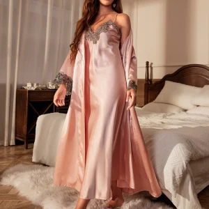 Hot-selling solid-color polyester nightgown lace see-through robe for women 2pcs set