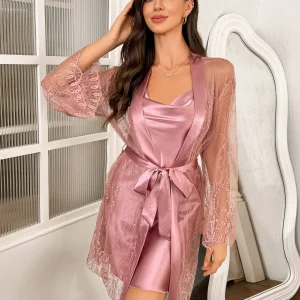 Contrast Lace Pajama Set Long Sleeve Robe With Belt V Neck Slip Dress Women’s Sleepwear Loungewear