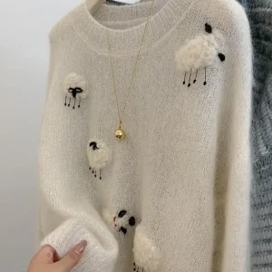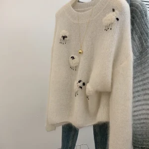 White Casual Sweater For Women 2025 New Long Sleeved O-Neck Warm Knit Pullovers Autumn Winter Korean Cute Animals Woolen Tops