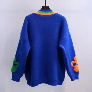 Blue Acrylic Knit V-Neck Letter Flower Casual Women’s Cardigan Sweater Single Breasted Cardigan For Women Clothing Thick Winter